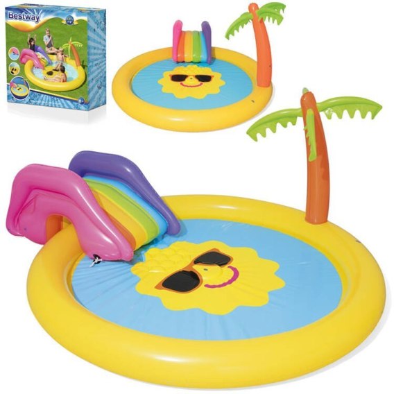Oryginalny plac zabaw ze zjeżdżalnią dla maluszka firmy Bestway to świetna propozycja dla małych dzieci na upalne letnie dni. Bajecznie kolorowy, dmuchany plac zabaw z grafiką uśmiechniętego słoneczka przyciągnie każde dziecko do zabawy. Basen wykonany z miękkiego lecz wytrzymałego winylu. Atrakcją basenu jest wyjmowana, dmuchana kolorowa zjeżdżalnia oraz wbudowany rozpylacz umieszczony na środku baseniku. Wystarczy podłączyć węża ogrodowego, a fontanna zacznie działać.
