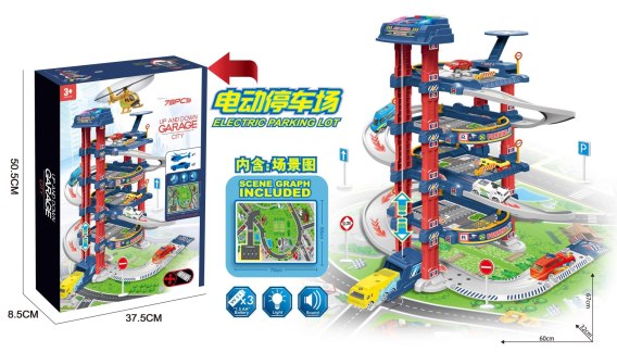 Wielopoziomowy parking posiada miejsca parkingowe, stację benzynową, podnośnik dla samochodów oraz lądowisko dla helikopterów. Zabawka zasilana jest bateriami typu 3 x AA 1,5V, baterii brak w zestawie. Parking wykonano w skali 1:64.