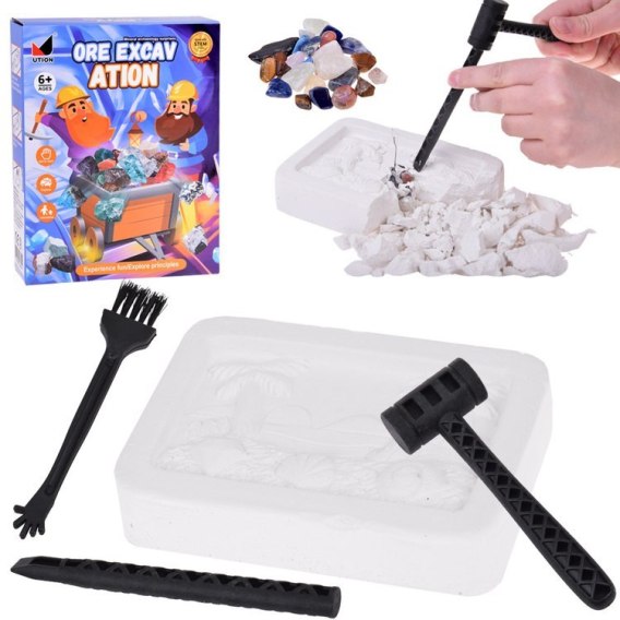 Inspirująca zabawka dla każdego dzieciaka, które w przyszłości chciałoby zostać archeologiem lub poszukiwaczem skarbów. Zabawka w atrakcyjnej formie stanowi symulację wykopalisk i z pewnością zajmie dziecko na dłuższy czas. Zadaniem dziecka jest za pomocą młoteczka i dłuta odnaleźć kolejne zatopione skarby w gipsowym odlewie. Choć zabawa jest pracochłonna, nagradza nas wieloma pięknymi kamieniami, które będą świetną ozdobą każdego dziecięcego pokoju.