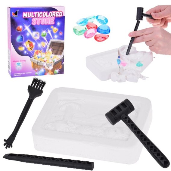 Inspirująca zabawka dla każdego dzieciaka, które w przyszłości chciałoby zostać archeologiem lub poszukiwaczem skarbów. Zabawka w atrakcyjnej formie stanowi symulację wykopalisk i z pewnością zajmie dziecko na dłuższy czas. Zadaniem dziecka jest za pomocą młoteczka i dłuta odnaleźć kolejne zatopione skarby w gipsowym odlewie. Choć zabawa jest pracochłonna, nagradza nas wieloma pięknymi kamieniami, które będą świetną ozdobą każdego dziecięcego pokoju.