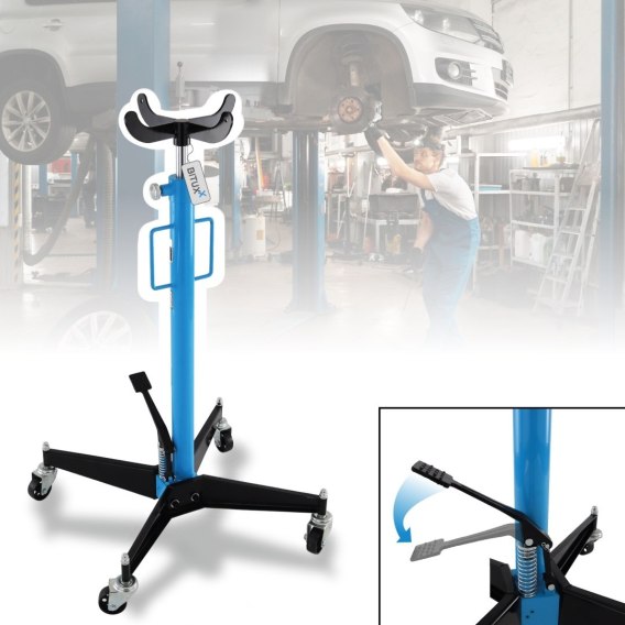 Profesjonalny podnośnik hydrauliczny BITUXX do skrzyń biegów, silników i innych elementów montowanych pod pojazdem.