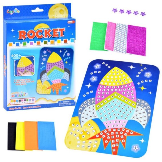 Mozaika Rakieta to kreatywny zestaw dla dzieci lubiących prace plastyczne. Zestaw składający się kolorowego obrazka, na który należy wykleić piankowymi kwadracikami, oczywiście dostosowując kolory i kształty. Prosty, kolorowy zestaw dla dzieci, które uwielbiają tworzyć coś samodzielnie. Doskonale rozwija zdolności plastyczne dziecka dając wiele radości i zabawy. Zabawka rozwija koordynację ręka-oko, precyzyjne umiejętności motoryczne, a także sprzyja twórczemu myśleniu. Gotowy obrazek można powiesić na ścianie, stworzyć z niego np. okładkę własnej książeczki itp.