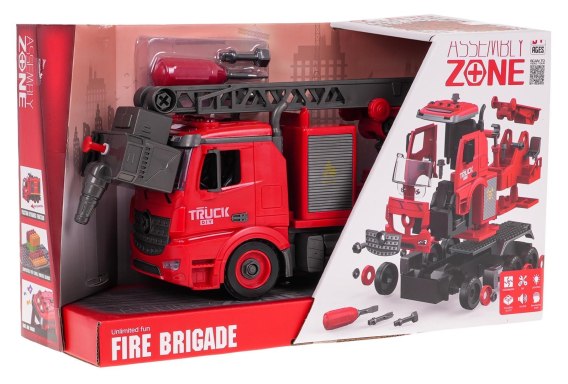 Interaktywna straż pożarna do rozkręcania z funkcją wody dla dzieci od 3-go roku życia. W zestawie znajduje się śrubokręt z wymiennymi końcówkami do rozkręcenia pojazdu. Wóz strażacki posiada napęd na przednie koła. Na dachu wozu strażackiego znajdują się dwa mrugające światełka oraz przyciski funkcyjne. Przyciski uruchamiają odgłosy alarmu, zapalania pojazdu, cofania oraz klaksonu. Wysięgnik wozu strażackiego można podnosić, opuszczać i wysuwać manualnie. Możemy obracać nim również o 360 stopni. Po napełnieniu zbiorniczka wodą i naciśnięciu przycisku na końcowym etapie węża strażackiego będzie pryskać woda. Zabawka zasilana jest bateriami typu 3 x AG13 (w zestawie).